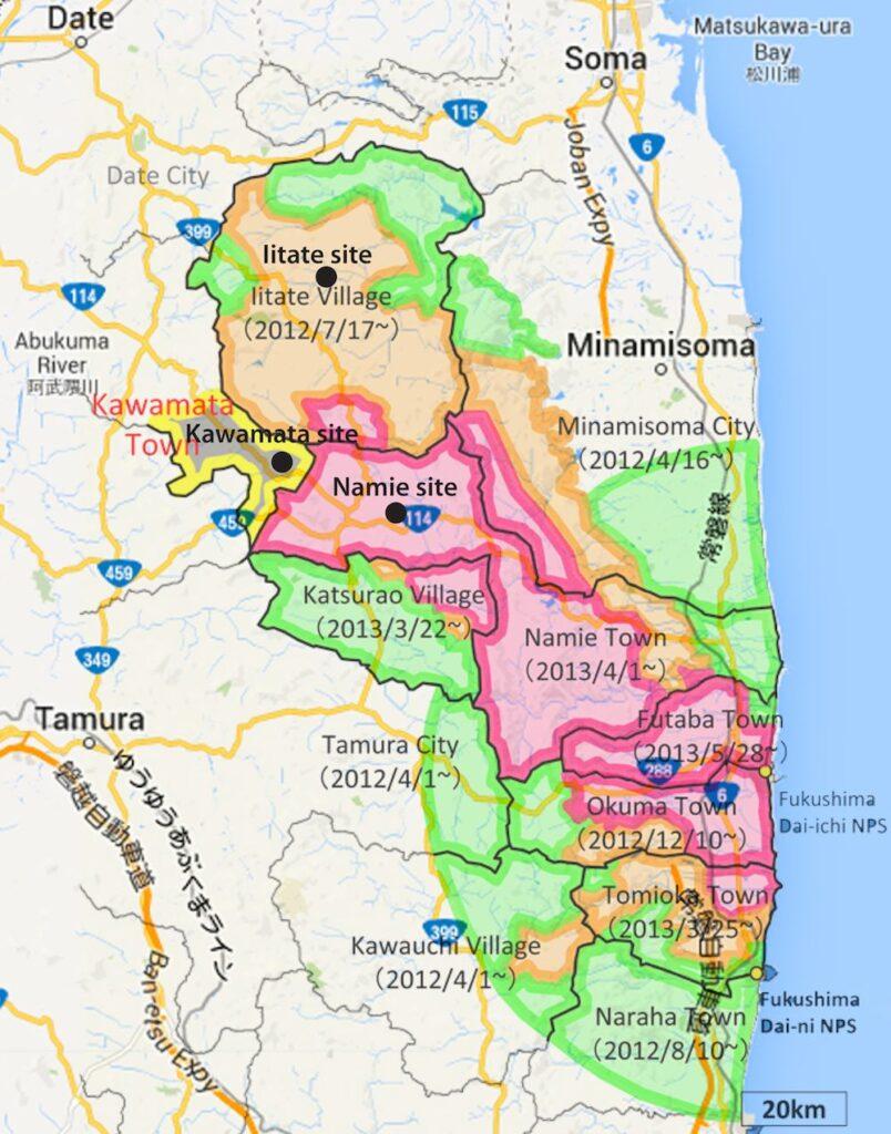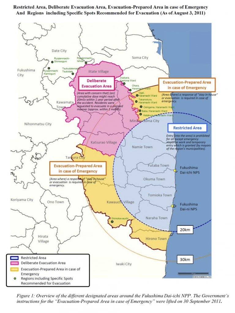 At this point, evacuation zones included the original 20km semicircle, as well as an additional “planned evacuation zone” to the northwest, encompassing Iitate and parts of other towns.